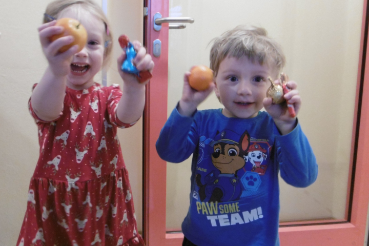 An diesen Nachmittagen zog ein herrlicher Duft von frisch gebackenen Plätzchen durchs Haus, die auch noch wunderbar schmeckten. Kurz darauf besuchte uns der Nikolaus am 6. Dezember, der jedem Kind eine Süßigkeit und eine Mandarine in die Schuhe steckte. Die Freude war groß, dass der Nikolaus auch den Weg in den Kindergarten gefunden hatte.