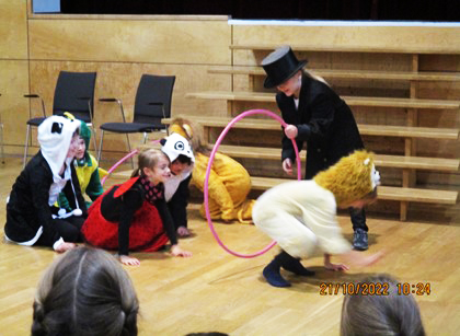 Aber auch schweigende Momente gab es mit Hilfe der Pantomime zu sehen. In jeder der Darbietungen war die Zahl 10 versteckt. So z.B. wurde 10-mal mit dem Seil gesprungen oder es gab 10 Reifen.