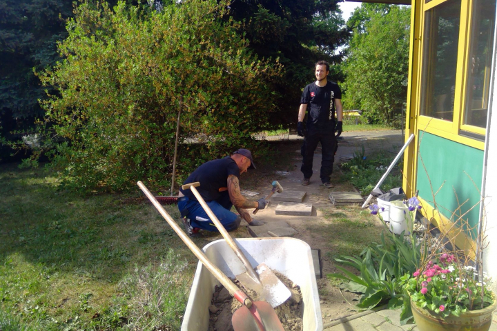 So wurde Holz geschliffen und lasiert, das Gartentor erhielt einen neuen Farbanstrich und ein echter Glückspilz weist uns nun daran den Weg zum Kinderhaus. Die Kräuterspirale, Hochbeete und der Sinnespfad wurden vom Unkraut befreit und können nun wieder ihrem eigentlichen Zwecke dienen.