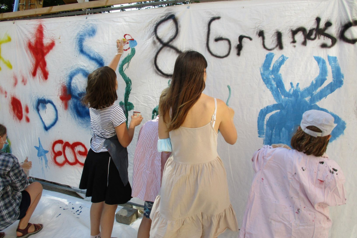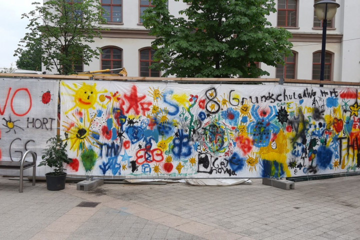 An einem schulfreien Tag im Juni haben wir Ferienhortkinder kurzerhand einen großen Teil der Plane bunt gestaltet.