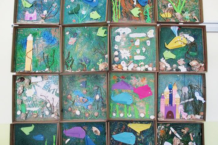 Zum Schluss haben wir Murmelbild-Collagen mit Muscheln, Papierfischen und Woll-Seegras gestaltet.